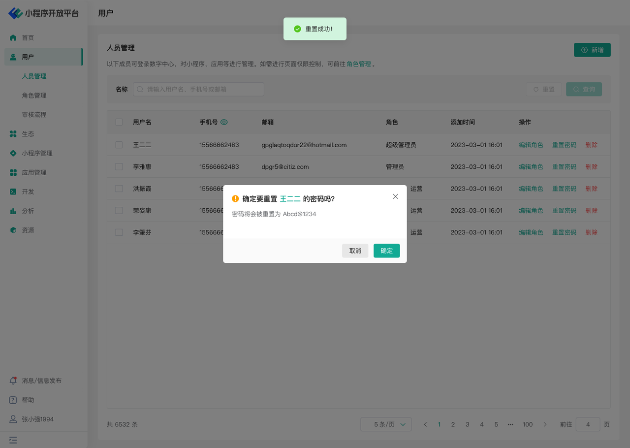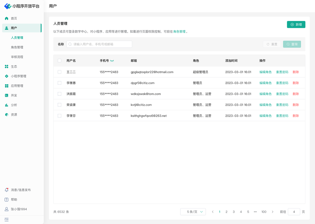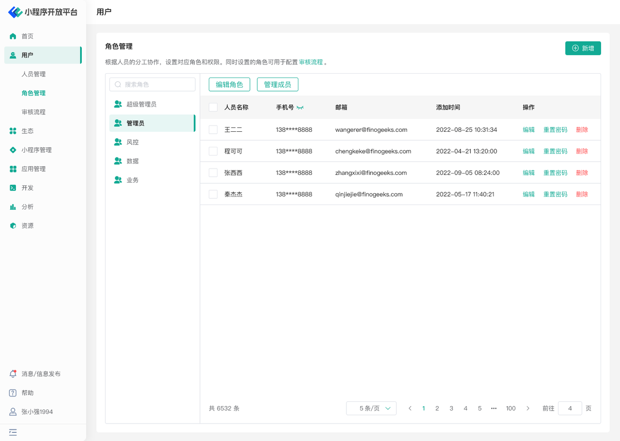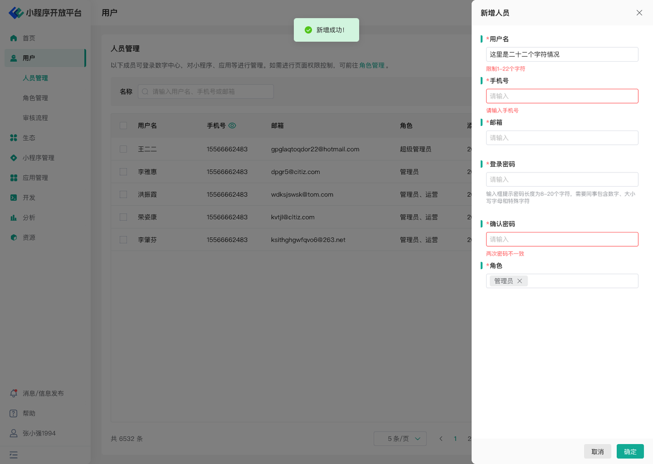 - 通过「新增」功能打开新增页面,由管理者填写用户的名称、手机号、邮箱及密码等信息,并预先配置好角色。