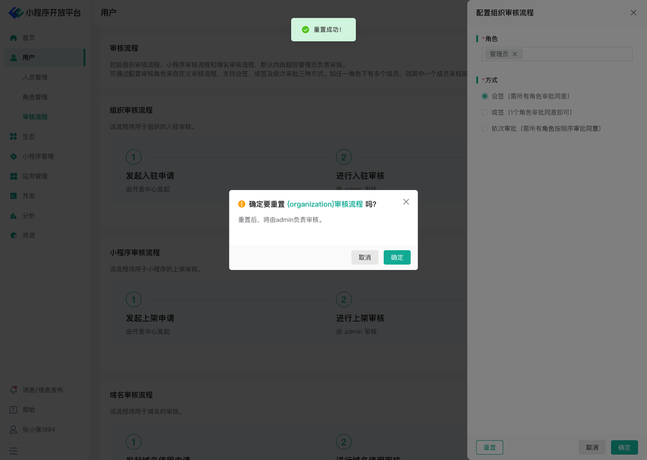 - 重置:支持重置审核流程为‘由 admin 账号审核’