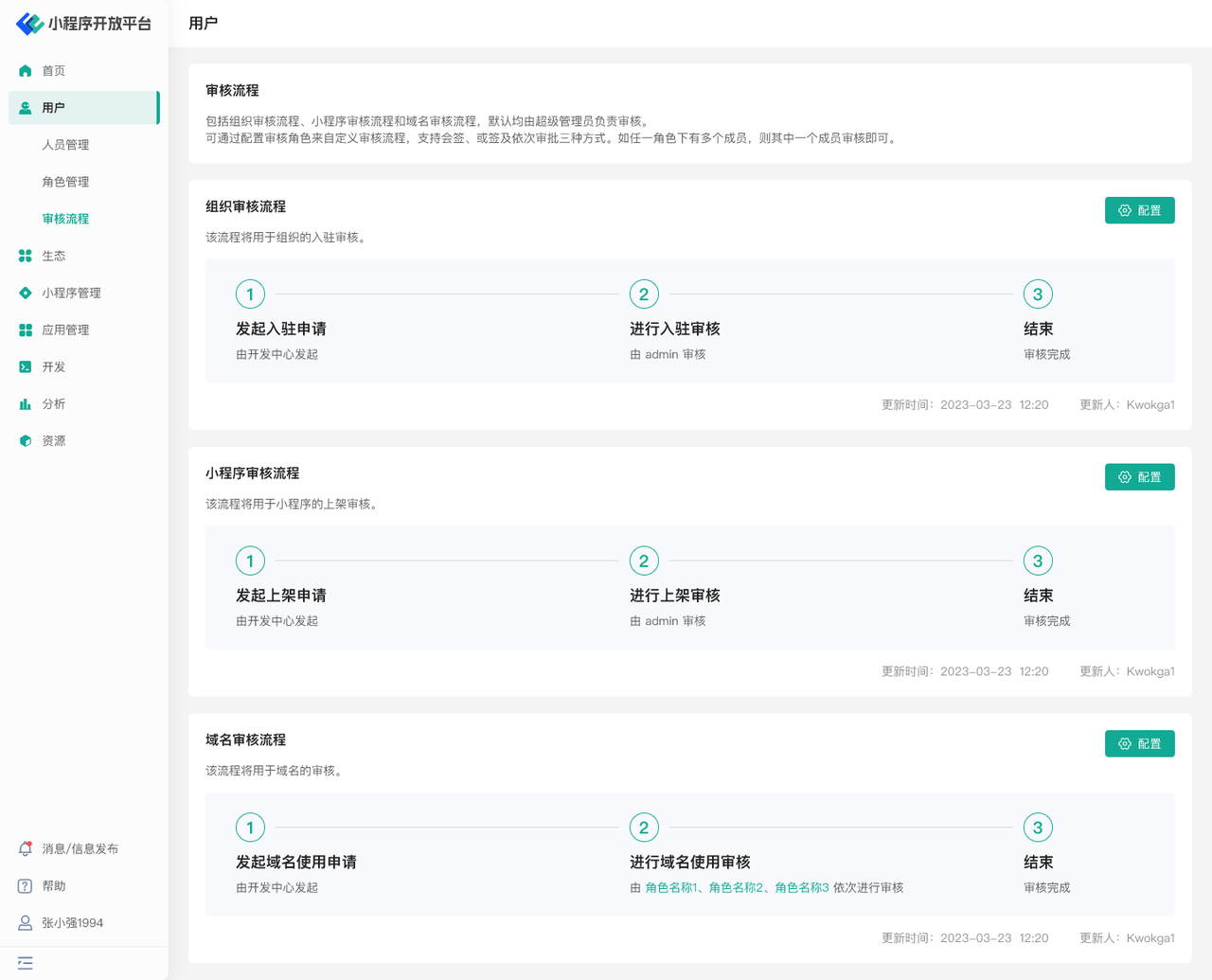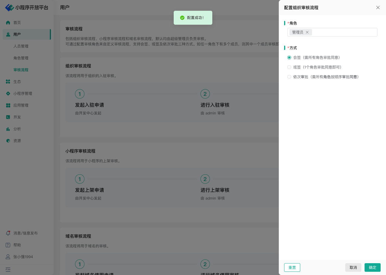 自定义流程:通过「配置」功能进入配置页,选择审核角色及审核方式,提交后即时生效。