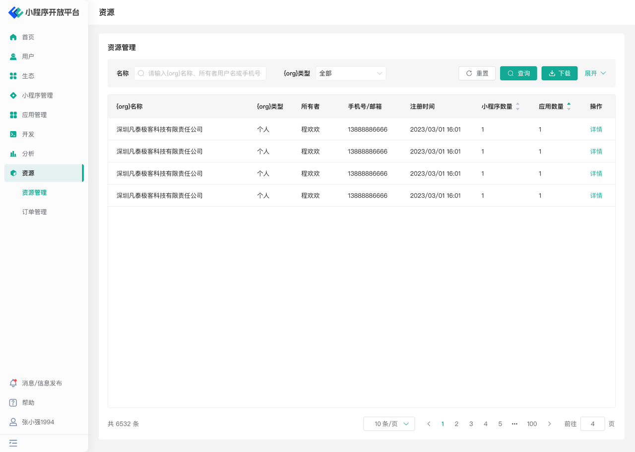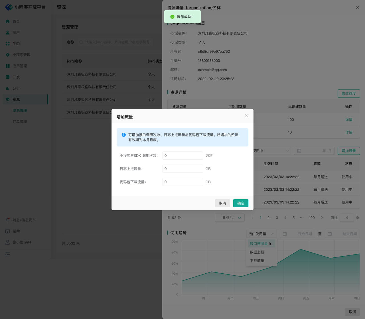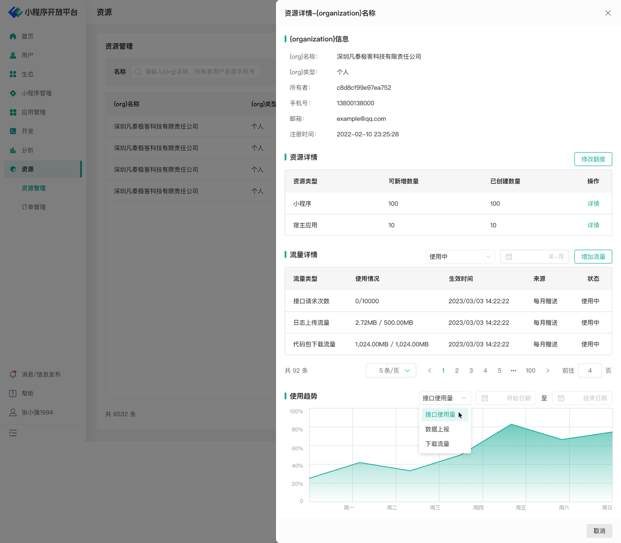 - 查看各个企业/个人用户的资源情况,如小程序数量、应用数量、接口调用次数等的详情